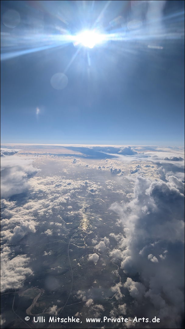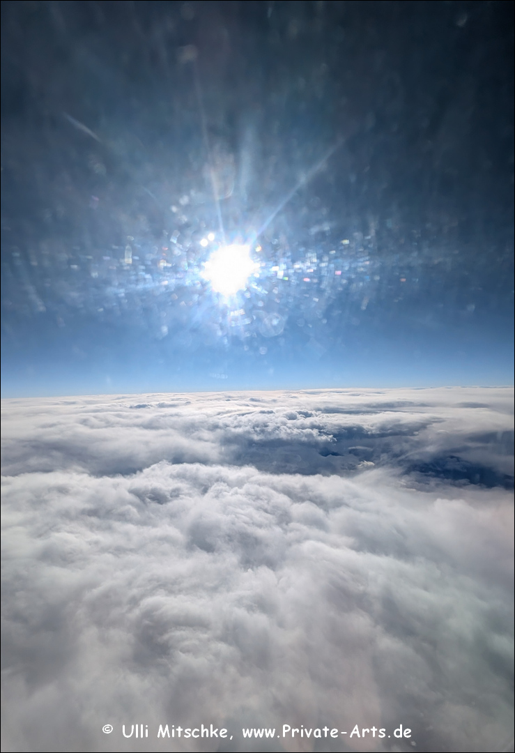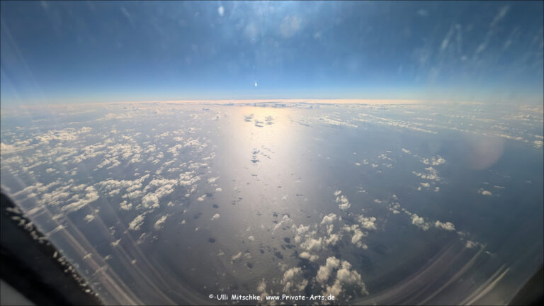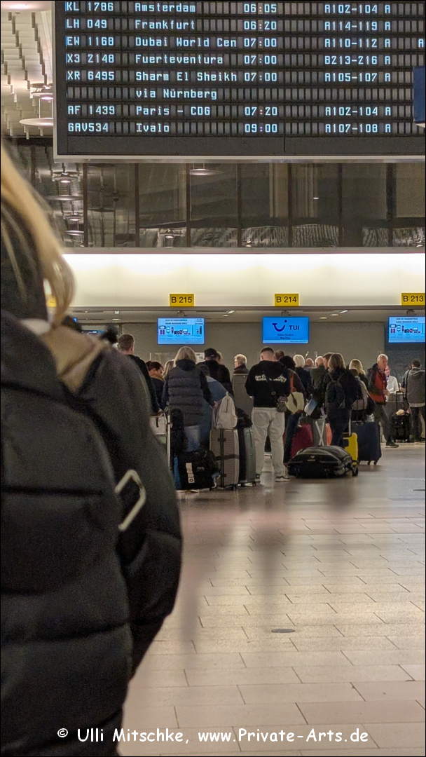 und es geht schon wieder gut los … die lange Schlange am Check-In ist relativ schnell abgearbeitet und es soll ganz normal auf Gate A geboarded werden, irgendwie ist da auf einmal auch relativ viel blaues Rundumlicht vor Gate A, die Bundespolizei ist auch da, dann plötzliche Verlegung nach Gate B, 15 Minuten Später dann sogar nach Gate C … Boarding läuft dann aber nicht über einen ‚Finger‘, wir werden mit einem Bus zur Maschine gebracht, die steht unerwartet irgendwo auf dem Vorfeld … später stellt sich heraus, es gab wohl einen Alarm für Gate A, irgendwo wurde ein herrenloser Koffer entdeckt, Abflug also gut 30 Minuten später 7:30h …