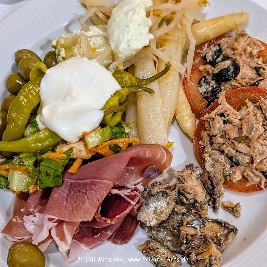 zwei Ankommgetränke und ein paar Fotos später mal ne kurze Pause, war ja heute Morgen doch etwas früh, abends dann zum ersten mal ans Buffet …